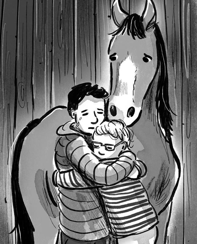 P260 is a scene with emotion and love shown between two brothers. It's a simple illustration of the boys embracing and a tear rolling down the main characters cheek with his horse tenderly standing over them. It is a moment which parents and siblings can resonate.